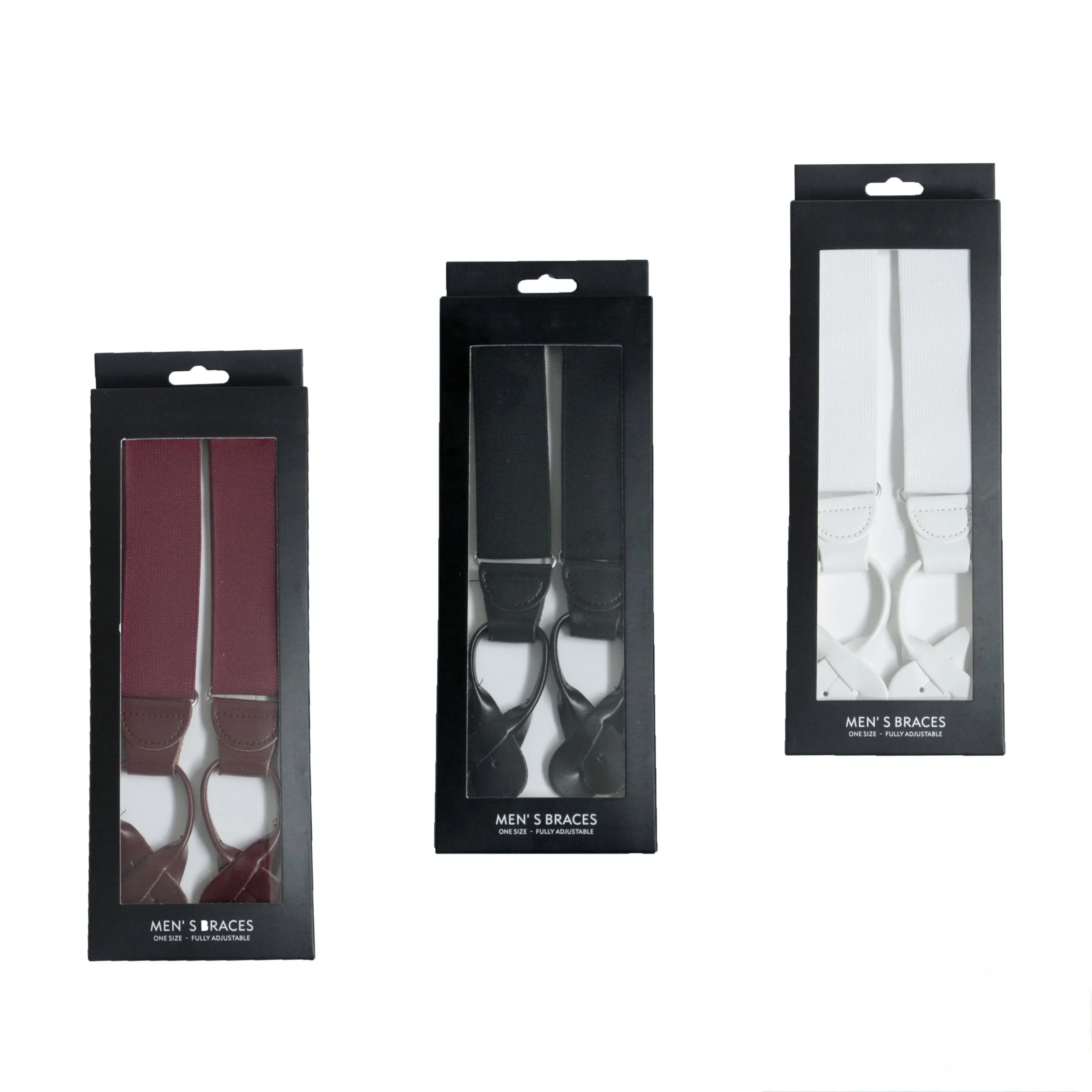 These traditional button on braces are available in Black, Burgundy or White. Rolled Leather End braces, fitting chests up to 44". X back design and supplied in a box.